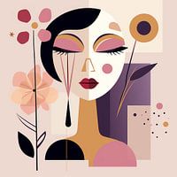 Een portret van een vrouw met bloemen op haar gezicht, uitgevoerd in de stijl van abstracte geometrische composities met een warm kleurenpalet van lichtroze en donkerbeige. De illustraties zijn charmant en tonen een sterke gelaatsuitdrukking, terwijl kubistische elementen subtiel in het beeld zijn verweven, wat resulteert in een levendige en enigmatische uitdrukking van 'gebeurtenissen'