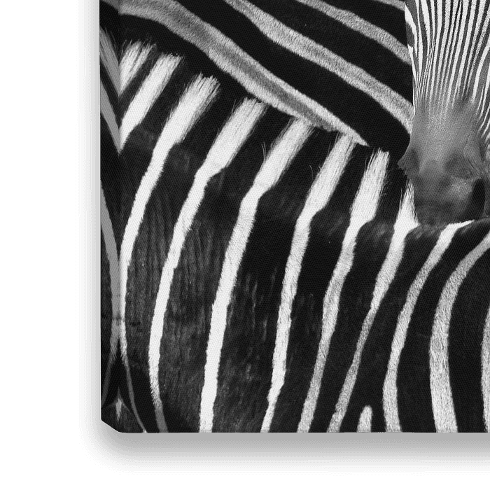Modern portret van een Zebra in zwart wit op vierkant formaat.