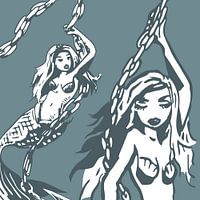 Twee zeemeerminnen. Digitaal kunstwerk van onderwater scene. Strak en modern werk in drie kleuren, wit en blauw.