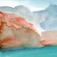 Modern abstract minimalistisch landschapsschilderij in turquoise, blauw, bruin en wit.