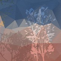 Moderne abstracte mixed media kunst. Botanische organische vormen gemengd met geometrische achtergronden. Neutraal gedempt kleurenpalet gecombineerd met rijke tinten en aardetinten.