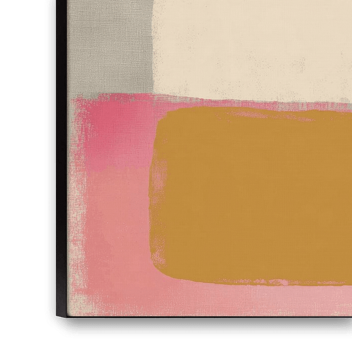 Dit moderne abstracte werk speelt met zachte structuren en heldere kleurblokken. Bovenaan vormt een raster van grijsgroene, handgeschilderde stippen een luchtige textuur, alsof ze langzaam vervagen in het linnen. In het midden brengt een crèmekleurig vlak rust en licht, terwijl de onderste okergele vorm warmte toevoegt en subtiel contrasteert met de roze gloed eromheen. De combinatie van kalme tinten en speelse details maakt dit kunstwerk ideaal voor interieurs met een Japandi, Scandinavische of minimalistische uitstraling.