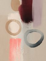Een serene abstract in zachte greige- en zandtinten, opgebouwd uit transparante verflagen, speckles en organische penseelstructuur. De diepe bordeaux baan geeft rust en gewicht, terwijl de cirkelvormen in warm oker en blauwgrijs het werk een minimalistische, bijna meditatieve dynamiek geven. Een koraalroze veeg zorgt voor een subtiel…