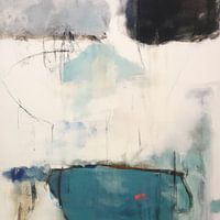 Modern abstract schilderij in wit, blauw en zwart met een klein snufje rood. Op een abstract werk raak je niet snel uitgekeken!