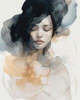 Modern abstract portret, aquarel. Portret van een jonge vrouw met gesloten ogen in bruin, zwart en blauwtinten. Kies zelf het formaat en materiaal voor deze blikvanger.