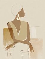 Een stijlvolle vrouw in zachte aardetinten, gehuld in een tijdloos silhouet met oversized oorbellen en een serene blik opzij. De lijnen zijn minimalistisch maar expressief, met een balans tussen abstractie en elegantie. Deze illustratie straalt rust, zelfverzekerdheid en ingetogen schoonheid uit — als een stille ode aan vrouwelijke kracht in eenvoud.