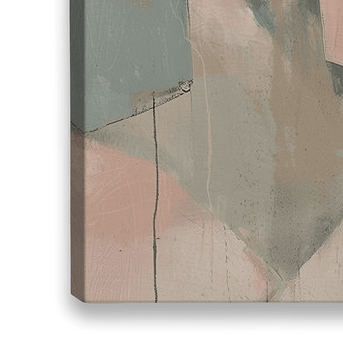 Modern abstract portret van een donkerharige vrouw met de titel "rust" in terracotta en een zacht blauwgroene tint. De vrouw laat haar hoofd op haar schouder rusten. Op groot formaat is dit echt een statement aan je muur!
