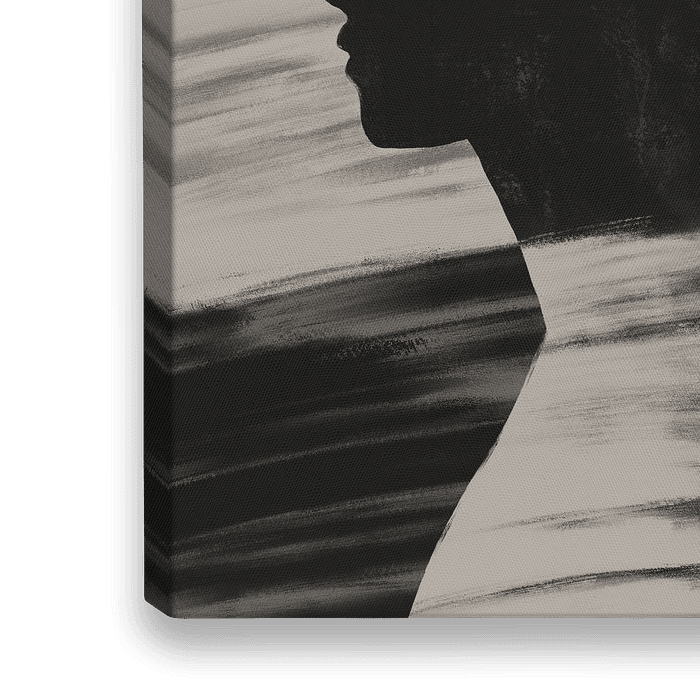 Dit schilderij laat in het zwart-wit een geschilderde vrouw zien met opgestoken haar. Dit is geschilderd in een minimalistische, moderne en abstracte stijl.