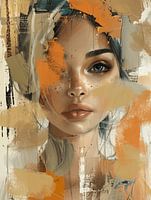 Modern abstract portret in oranje, goud en taupe. Kies zelf het formaat en materiaal bij dit werk en maak het helemaal passend voor jouw interieur.