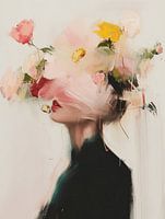 Modern abstract portret van een vrouw die bedolven wordt onder bloemen in pastelkleuren. Een bijzondere blikvanger voor je interieur! Kies zelf het formaat en materiaal bij dit werk en maak het helemaal naar wens.