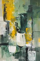 Dit prachtige schilderij combineert de dynamische elementen van abstracte kunst met de rustgevende aanwezigheid van een glas in het midden van de compositie. De levendige gele tinten contrasteren prachtig met de groene en grijze nuances, terwijl het wit en zwart de compositie in balans brengen. Het is een perfect kunstwerk om een…