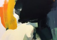 Modern abstract schilderij in warmen kleuren met de titel "warm glow". Oranje, geel, groen, zwart, donkerblauw, lichtblauw en wit. Contemporary art.
