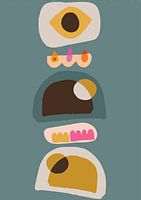 Moderne, abstracte collage. Illustratie van abstracte vormen tegen een blauw/groene achtergrond. Speels.