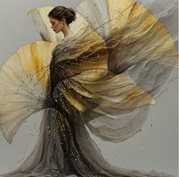 een jonge vrouw met knotje in haar haar en een gouden zwart wit bruin art noveau stijl geinspeerd jurk aan op de natuur pauwen kelk bloemen met veel zilver goud kettinkje gedecoreerd gedrapeerd stof op een grijze achtergrond.
