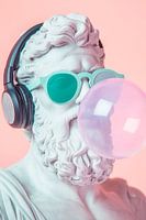 Een tijdloos, klassiek gezicht ontmoet moderne coolness: met een koptelefoon, een grote kauwgombel en een trendy zonnebril straalt deze sculptuur een humoristische lichtheid uit. Perfect voor een creatief kantoor of een chique woonkamer, het brengt een vleugje frisse, speelse stijl in elke kamer.
