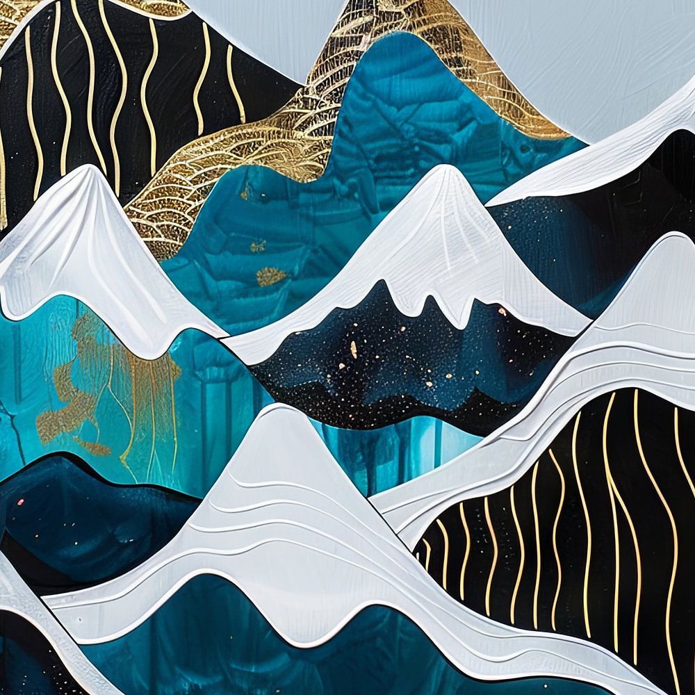 Deze betoverende schilderijen combineren de elementen van het berglandschap met een moderne, abstracte esthetiek. De gouden bergtoppen gloeien tegen een dramatische achtergrond van blauwe en zwarte tinten, terwijl een intens rode maan de hemel domineert. De vloeiende lijnen en het harmonieuze kleurenpalet van goud, blauw en rood creëren een verbluffende maar rustgevende sfeer. Deze werken zijn ideaal voor liefhebbers van moderne kunst en landschapschilderkunst die hun kamer een speciaal en indrukwekkend tintje willen geven.