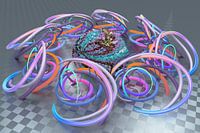 Dit 3d werk is digitaal gemaakt. Het is heerlijk om het werk te bekijken en de lijnen te boven die over het "schaakbord" zweven.