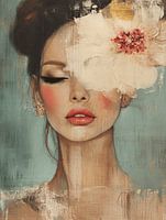 Modern chic en abstract portret van een vrouw met grote bloem. Een bijzondere blikvanger voor je interieur! Kies zelf het formaat en materiaal bij dit werk en maak het helemaal naar wens.