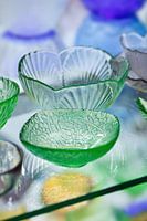 Close-up van modern design groene glazen schalen met een subtiel patroon weergegeven op een glasplaat