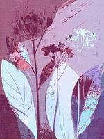 Het kleurenpalet is paarse, lila en mauve tinten, aangevuld met wit en een vleugje bordeaux. Grote, gestileerde bladeren contrasteren met de fijne, donkere bloemschermen.