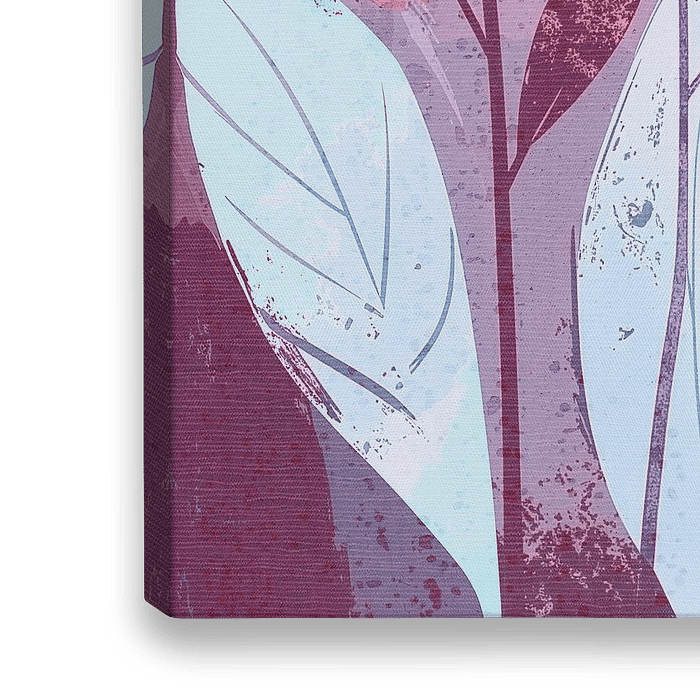 Het kleurenpalet is paarse, lila en mauve tinten, aangevuld met wit en een vleugje bordeaux. Grote, gestileerde bladeren contrasteren met de…