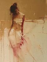 Modern en abstract figuratief portret in okergeel/bruin met wit en rood. Kies zelf het formaat en materiaal bij dit werk en maak er een bijzondere blikvanger van voor jouw interieur.