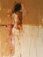 Modern en abstract figuratief portret in okergeel/bruin met wit en rood. Kies zelf het formaat en materiaal bij dit werk en maak er een bijzondere blikvanger van voor jouw interieur.