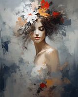 Modern en abstract kleurrijk portret. Een abstract portret van een jonge vrouw met bloemen in het haar. Een bijzondere blikvanger!