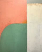 Modern en abstract, minimal art. Moderne vormen en lijnen vormen samen een minimalistisch schouwspel. Kies zelf het formaat en materiaal bij dit werk. Oranje, grijs en groen.