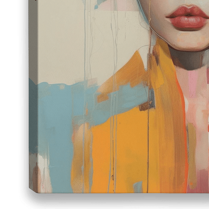 Modern en abstract portret "Kiss and tell". Dit portret in collagestijl is een echte blikvanger aan je muur. Pastelkleuren en bloemen maken samen een mooi geheel.