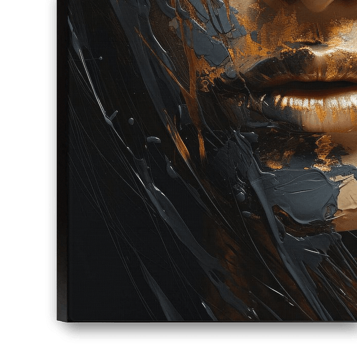 Modern en abstract portret, bedekt met verf. In oranje goud en grijstinten. Een bijzondere blikvanger! Kies zelf de afmeting en het materiaal en maak dit portret helemaal passend voor jouw interieur.