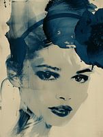 Blauw, modern en abstract portret, inkt. Een bijzondere blikvanger voor je interieur! Kies zelf het formaat en materiaal en maak dit werk helemaal passend en naar wens.