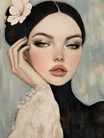 Modern en abstract portret in pastelkleuren en zwart voor het contrast. Helemaal in de stijl van nu! Mag ze jouw interieur op komen fleuren? Kies zelf het formaat en materiaal bij dit werk.