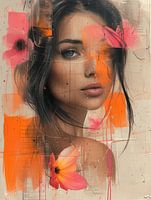 Modern en abstract portret in oranje en roze neon. Kies zelf het formaat en materiaal bij dit werk en maak er een bijzondere blikvanger van voor jouw interieur.