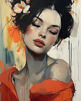 Modern en abstract portret van een jonge vrouw met een bloem in het haar. Kies zelf het formaat en materiaal voor dit werk en maak er een echte blikvanger van voor jouw interieur.