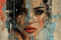 Modern en abstract portret in lichtblauw en oranje tinten. Kies zelf het formaat en materiaal bij dit werk en maak het passend voor jouw interieur.