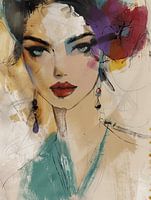 Modern en abstract portret in roze, geel, paars en turquoise. Kies zelf het formaat en materiaal bij dit werk en maak er een bijzondere blikvanger voor je interieur van.