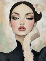 Modern en abstract portret in pastelkleuren en zwart voor het contrast. Helemaal in de stijl van nu! Mag ze jouw interieur op komen fleuren? Kies zelf het formaat en materiaal bij dit werk.