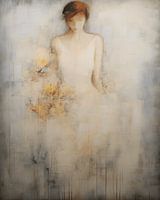 Modern en abstract "Flower girl". Een bijzonder portret in zachte kleuren met een romantische en poëtische uitstraling. Ondanks dat het vervaagd is, zijn nog goed de contouren van een jonge vrouw met bloemen herkenbaar.