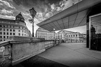Vanonder de overkapping van de moderne entree van het Albertina Museum heb je een geweldig uitzicht op de oude binnenstad van Wenen