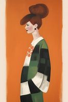 Modern en kleurrijk geïllustreerd portret van een jonge vrouw met rood haar met groen-witte kleding en een vleugje oranje tegen een oranje achtergrond.