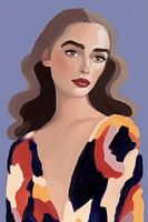Modern en kleurrijk portret van een jonge vrouw in een jurk met een drukke print tegen een lila / paarse achtergrond. Een hip werk voor aan je muur!