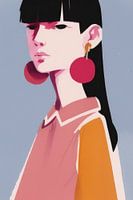 Modern en kleurrijk geïllustreerd portret van een donkerharig meisje met een strakke pony en lang haar. Mooie kleurencombinatie in roze en oranje.