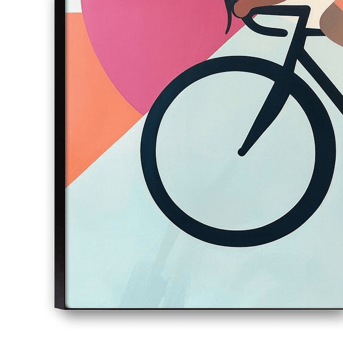 De dynamiek van een fietser is gevangen in een fascinerend samenspel van kleuren en geometrische vormen. Het atletische lichaam beweegt met krachtige kracht in een smeltkroes van heldere tinten, terwijl het contrast met de zachtere achtergrondelementen een opwindende energie creëert. De compositie straalt een gevoel van snelheid en vrijheid uit.