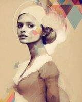 Modern geïllustreerd portret in pastelkleuren en sepia. Voor dit werk combineerde ik geometrische vormen in zowel de achtergrond als de jurk van het model. De jurk en het model zelf zijn in sepiatinten, de achtergrond in zogenaamde "colorblocks" voor een bijzonder effect. Erg mooi groot aan de muur!