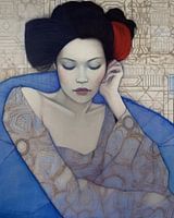 Modern geïllustreerd portret van een donkerharige vrouw met gesloten ogen. Dit werk heeft een dromerige sfeer, in de kleuren blauw, zwart, bruin en rood.