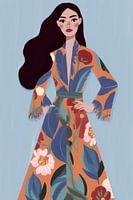 Modern en kleurrijke illustratie van een jonge vrouw in een jurk met een drukke print tegen een lichtblauwe achtergrond. Een hip werk voor aan je muur!