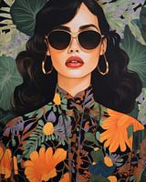 Modern geïllustreerd portret in voornamelijk groen en oranje tinten. Voor wie echt eens iets anders wil! Kies zelf het formaat en materiaal.