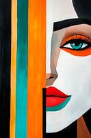 Een indrukwekkend spel van kleuren en vormen brengt een fascinerende kant van het gezicht tot leven. Levendige oranje tinten, koele groentinten en krachtige zwart-wit contrasten trekken op magische wijze de aandacht. Deze buitengewone kunst is perfect voor een moderne woonkamer om te schitteren als een stijlvol statementstuk dat gespreksstof oplevert.