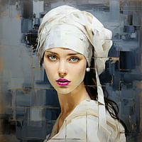 Rene van den Berg, een hedendaagse kunstenaar, heeft een unieke benadering van het klassieke meesterwerk "Meisje met de parel" van Vermeer. In zijn digitale schilderij kiest hij voor een abstracte interpretatie, waarbij hij voornamelijk blauwe en witte tinten gebruikt. De contouren van het meisje zijn herkenbaar, maar vervagen in een werveling van digitale penseelstreken die de vloeibaarheid en dynamiek van moderne kunst weerspiegelen. De iconische parel, hoewel nog steeds prominent aanwezig, is getransformeerd tot een lichtgevende bol die lijkt te zweven in een zee van blauwtinten. De achtergrond is een samensmelting van blauwe en witte vegen, waardoor het geheel een dromerige, bijna etherische uitstraling krijgt. Van den Berg's interpretatie is een eerbetoon aan Vermeer's vakmanschap, terwijl hij tegelijkertijd de grenzen van traditionele en digitale kunst verlegt.